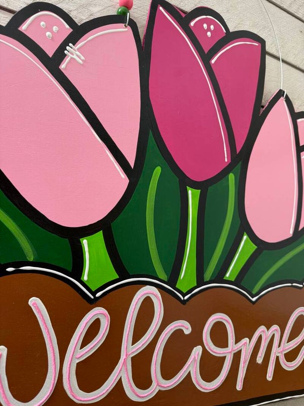 This is a beautiful door hanger with a pop of pink colors to compliment your front door! This door hanger was made from 1/4 inch maple wood. Cut, sanded, painted and sealed with several clear coats for indoor/outdoor use. Approximately 20 x 23 inches.
