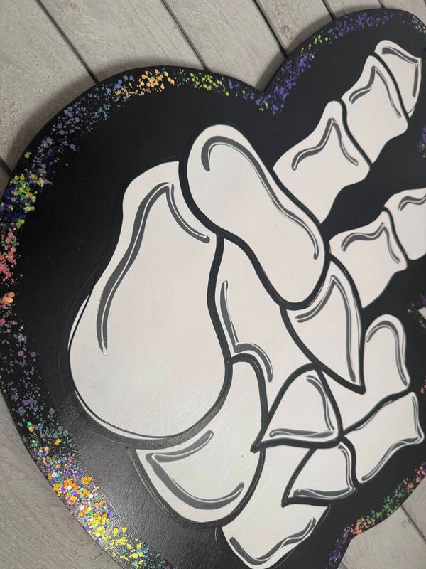 This skeleton peace sign door hanger is perfect for spooky season. Accents of beautiful glitter really make this a fun piece! Adding a bow is your choice. Also can be personalized.